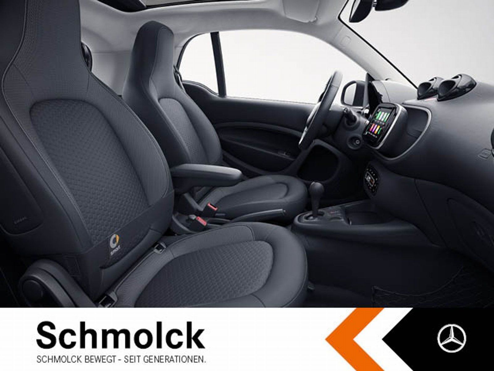 Kombiinstrument mit farbigem 3,5" Display, Ambientebeleuchtung, Panoramadach, Fußmatten Velours schwarz, Mittelkonsole mit Rollo und Mittelarmlehne vorn (klappbar), Ablagefach in Heckklappe, Lenksäule höhenverstellbar, Handschuhfach abschließbar, Lenkrad im 3-Speichen-Design in Leder, Ablagenetz an Mittelkonsole, 12-Volt-Steckdose, Bordcomputer, Brillenfach für Fahrer und Beifahrer, Glas dunkel getoent, Laderaumabdeckung, smart Media-System connect mit digitalem Radio, Polsterung in Stoff schwarz mit Ziernähten in weiß